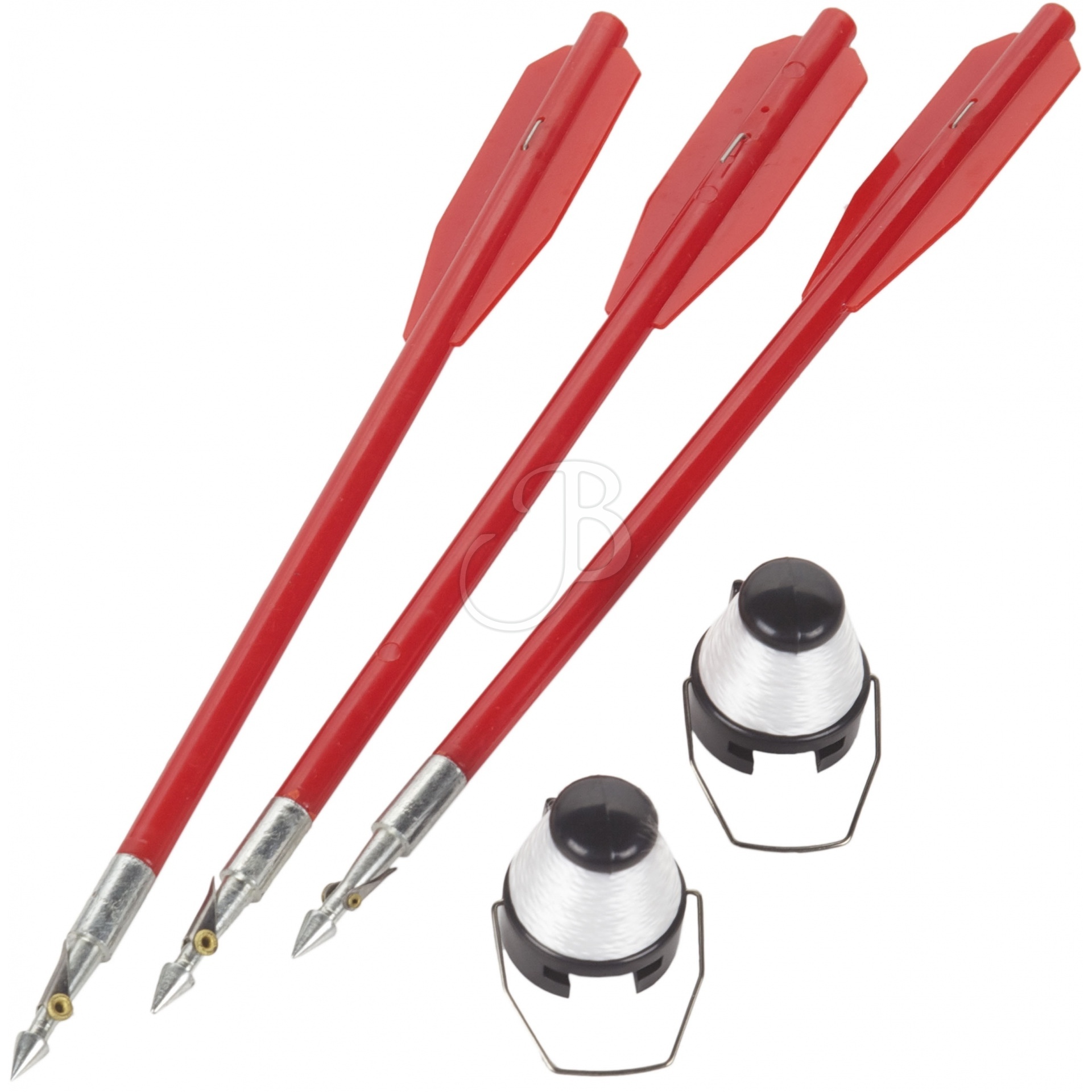 Im Lieferumfang enthalten sind die Kompaktarmbrust mit Sehne, eine Bedienungsanleitung, 9 Bolzen (3 Mini‑, 3 Standard‑, 3 Angelbolzen), 3 Angelspulen und Stahlkugeln mit 6 mm Durchmesser.