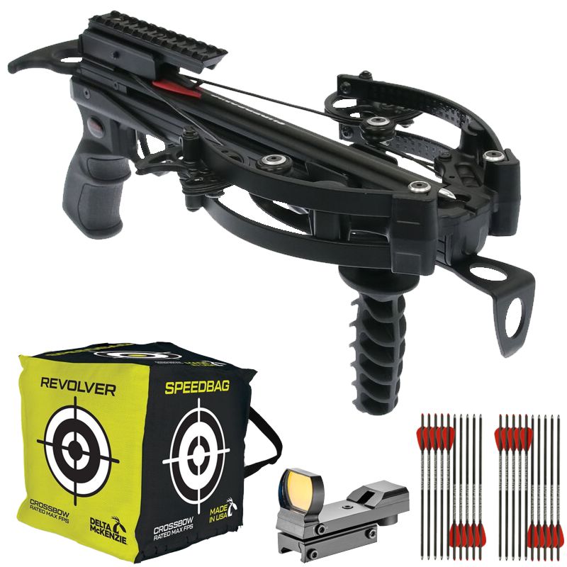 Im Supersonic Herbstangebot erhältst du die ultrakompakte X‑Bow FMA Supersonic Compoundarmbrust, zwei Sets Carbonbolzen, ein RedDot Visier, Sehnenwachs und einen Delta McKenzie Speedbag 13″ Zielwürfel. Dieses Bundle kombiniert alles, was du für präzisen Spass brauchst.